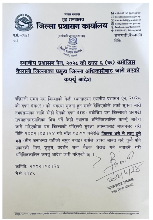जिल्ला प्रशासन कार्यालय कैलालीद्वारा आज साँझ ५ बजेदेखि जिल्लाभर लागु हुनेगरी अनिश्चितकालीन कर्फ्यु जारी गरेको छ ।