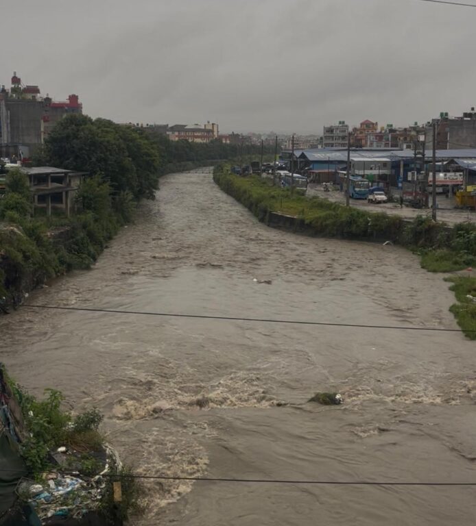 भक्तपुर र काठमाडौ छुट्याउने मनहरा नदीमा आएको बाढी । फोटो : अनुमोदन खबर