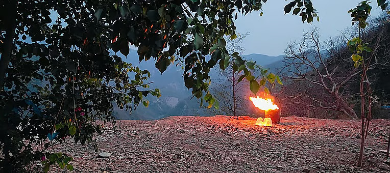 चमोलीको सडक छेउको भोजनालय बाहिर जलिरहेको फोहोरबाट निस्केको आगो र उडिरहेको कोइला वरपरको क्षेत्रसम्म फैलदै । वन विभागका अनुसार, धेरैजसो वन डढेलो मानवीय गतिविधिका कारणले हुन्छ / क्रेडिट: वर्षा सिंह।
