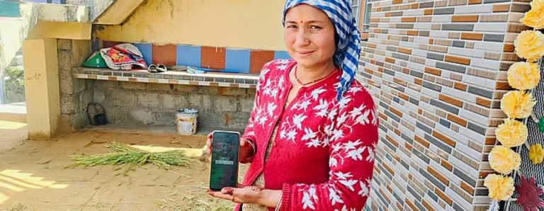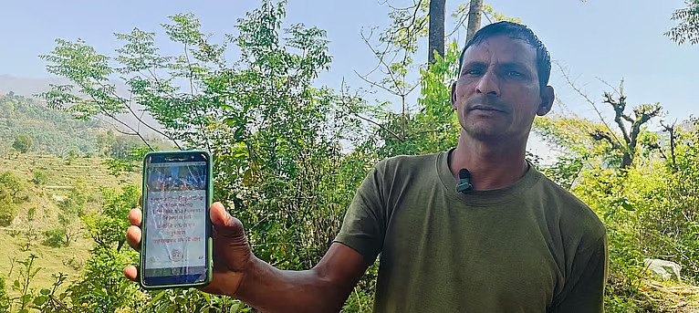 आफ्नो फोनमा डढेलो एप देखाउँदै कथूर वन पञ्चायतका सरपंच धर्मेश सैलानी/ क्रेडिट: वर्षा सिंह ।