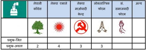 एमाले : गाेदावरी नगरपालिका, वर्दगोरिया गाउपालिका, चुरे गाउपालिका र जानकी गाउपालिका माओवादी केन्द्र : गौरीगंगा नगरपालिका,