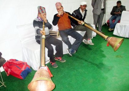 ८३ वर्षिय प्रेम पुल्लाथापाको टोली नौमतीबाजा बजाउँदै थियो । ७ वर्षिया अनुष्का थापा र ९