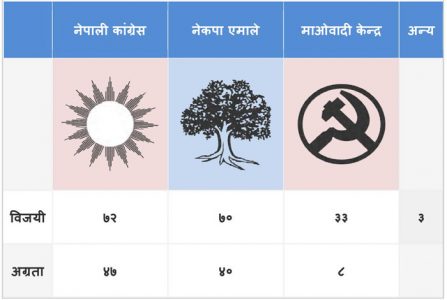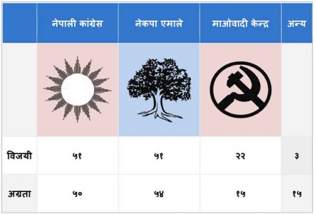 काठमाडौं । बैशाख ३१ गते भएको स्थानीय तह पहिलो चरणको निर्वाचनको मतगणनाअनुसार बुधबार रातिसम्म नेकपा (एमाले) र