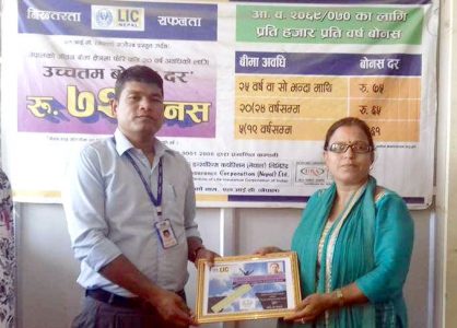 धनगढी । एकै दिनमा एक सय भन्दा बढी व्यक्तिको बिमा पोलिसी बनाउने बिमा अभिकर्तालाई लाइफ इन्स्योरेन्स कर्पोरेशन,