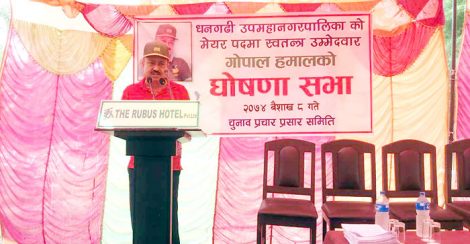 धनगढी । धनगढीका व्यापारी गोपाल हमालले धनगढी उपमहानगरपालिकाबाट प्रमुखमा स्वतन्त्र उम्मेदवारी घोषणा गरेका छन् ।