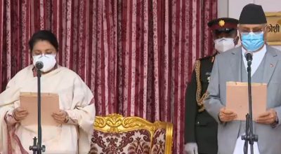 काठमाडौं । राष्ट्रपति विद्यादेवी भण्डारीले शुक्रबार नवनियुक्त प्रधानमन्त्री केपी शर्मा ओलीलाई सपथ ग्रहण गराएकी छन्।
