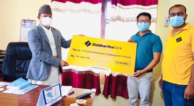 धनगढी । सिद्धार्थ बैंक लिमिटेडले सुदूरपश्चिम प्रदेश कोरोना कोषमा १० लाख रकम सहयोग गरेको छ