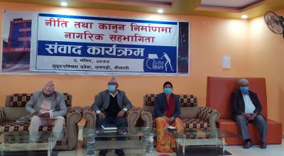 धनगढी । सुदूरपश्चिम प्रदेश सरकारले निर्माण गर्ने नीति तथा कानुनमा नागरिकको सहभागिता गराउनुपर्ने सरोकारवालाहरूले सुझाव