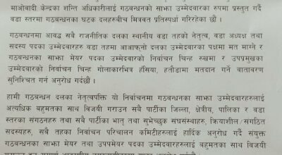 धनगढी / कैलालीको तीन दलिय गठवन्धनले बैशाख १२ गते मनोनयन दर्ता गरेका तर १६ गते