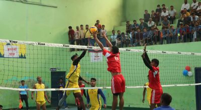 धनगढी / धनगढीमा जारी राष्ट्रिय पुरुष भलिबल प्रतियोगिताको मंगलबारको खेलमा नेपाल पुलिस क्लब तथा गण्डकी