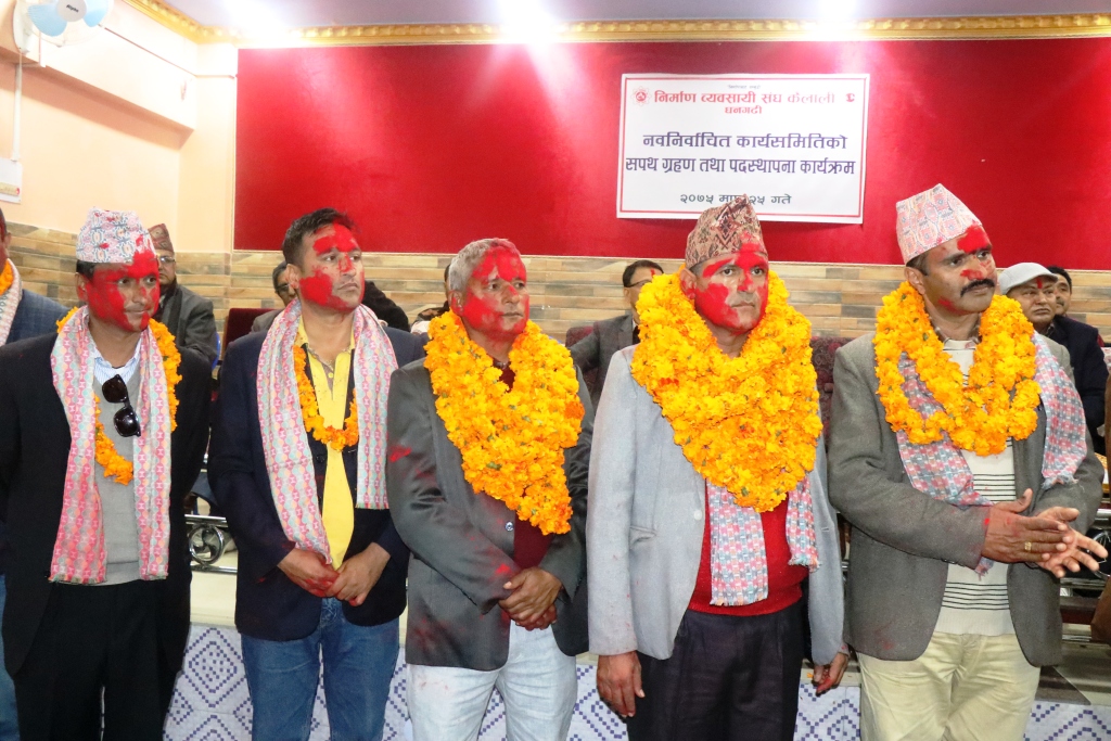 धनगढी । निर्माण व्यवसायी संघ कैलालीका नवनिर्वाचित पदाधिकारीको शुक्रबार पदस्थापना तथा सपथ ग्रहण भएको छ । संघको सभाहलमा संघका निवर्तमान अध्यक्ष प्रकाश सेठ्ठीको अध्यक्षतामा एक