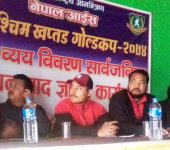 धनगढी । धनगढीमा ११ दिनसम्म सञ्चालन भएको अन्तर्राष्ट्रिय आमन्त्रण नेपाल आइस खप्तड गोल्डकप प्रतियोगिताको आयव्यय मंगलबार सार्वजनिक गरिएको छ । प्रतियोगिताको आयोजक सुदूरपश्चिम–११ स्पोर्ट्स क्लवका महासचिव प्रकाश शाहीले प्रतियोगितामा ९१